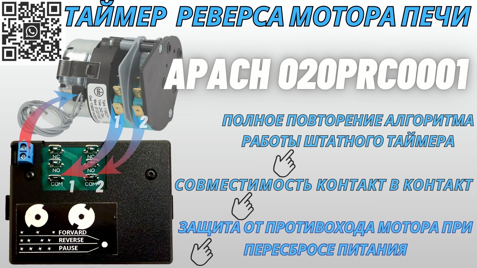 Для конвекционных печей марок APACH, полный аналог на современной элементной базе с защитой мотора от включения реверса в режиме противохода.